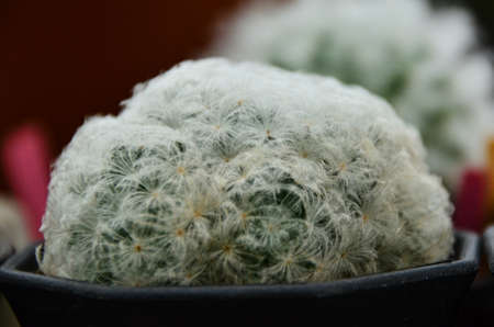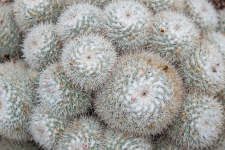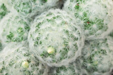 Closed up Mammilaria perbella cactus with white thorn texture background. Small beautiful and drought resistant, succulent plant