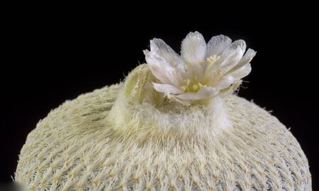 Cactus Epithelanta micromeris polycephala with flower isolated on Black