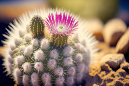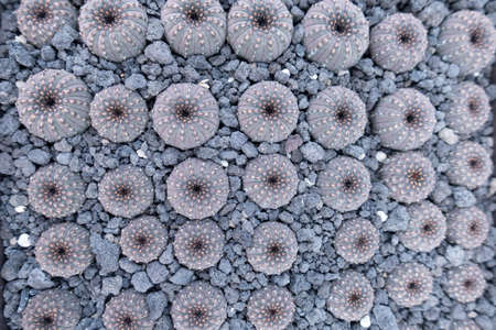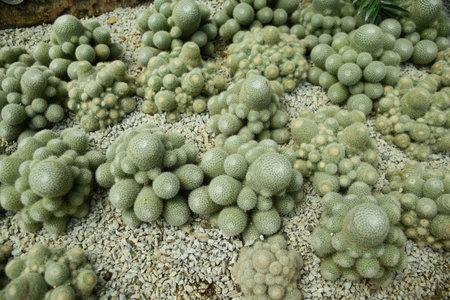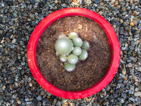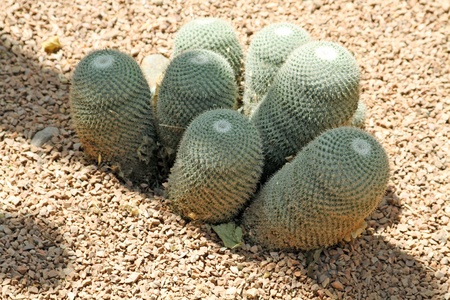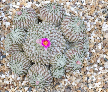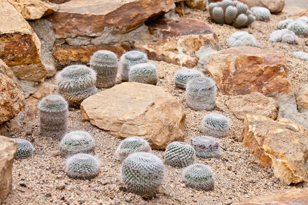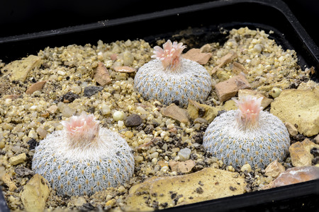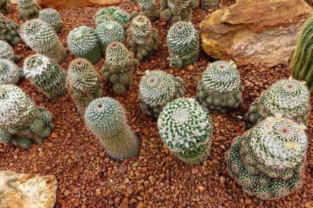 Close up Mammillaria epithelantha bokei on artificial habitat, live at rocky stone ground on desert. Image photo