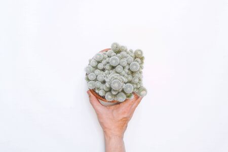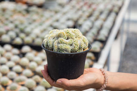Cactus species (Mammillaria elongata f. Cristata hort.), Grown in pots in greenhouses on a woman's palm.