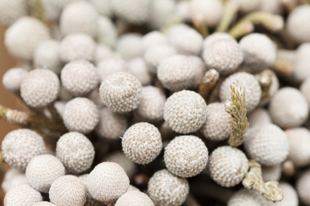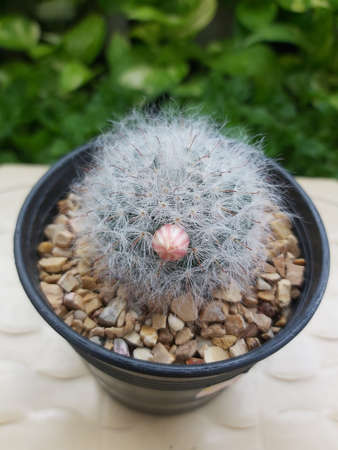 Mammillaria bocasana cactus natural patterns with white flower bud blooming top view background in garden