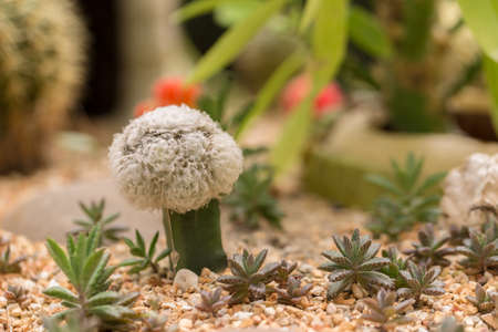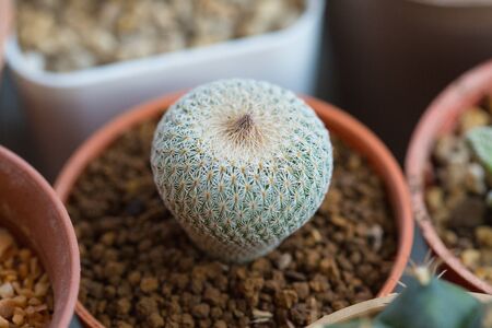 little Mammillaria plumosa cactus in garden, close up macro. photos with a narrow depth of field and succulent plants in a basic manner