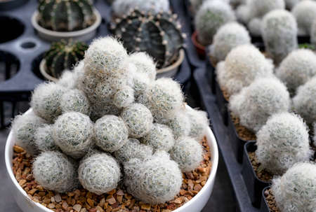 Top view of many small Mammillaria microthele with perbella cactus are growing on white flower pots for sale in outdoor plant market