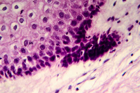 Cancer of cervix. Light micrograph of cervical biopsy. Photo under microscope. Selective focus