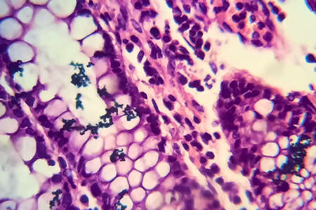Ovarian cancer, light micrograph, photo under microscope. Photograph shows a fragment of a cancerous tumor in the female ovary. Selective focus