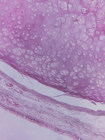 Human hyaline cartilage bone under microscope view for education pathology. Human tissue.