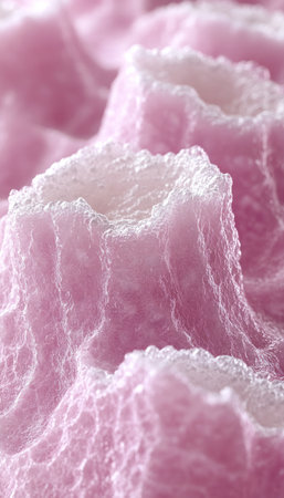 A close-up image of a pink and white textured surface, resembling a natural material or organic structure.