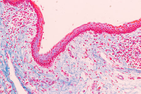 Transitional epithelium tissue of the urinary bladder under microscope, light micrograph, hematoxylin eosin staining
