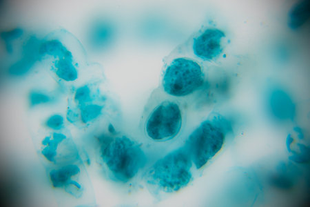 Microscopic image of blue-stained cells with different shapes and sizes on a light background, displaying cellular structures and details in laboratory conditions