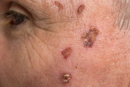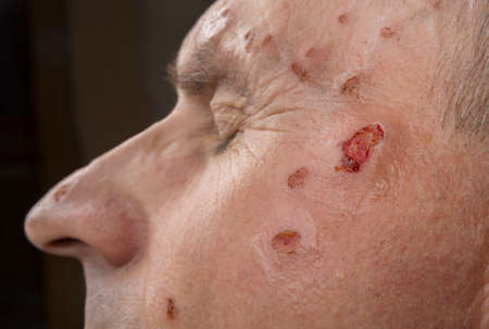 Senior adult male with stitches in the cut after surgery for removal of basal cell carcinoma caused by sun damage