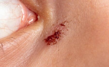Close-up of the wound that remained after excision of the nevus. Removal and treatment of benign skin lesions. Surgery. Doctor and patient in one shot. Skin disease treatment and surgical care concept