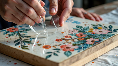 Hands pouring epoxy on floral art canvas. That the image is generated using AI.