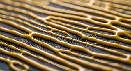 A detailed macro photograph of a thick, golden viscous liquid, such as resin, glue, or honey, applied in parallel lines onto a textured blue surface. The sticky substance creates an interesting abstract pattern with its unique texture and glossy finish.