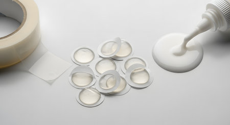 A top-down view of various adhesive products on a clean white background. This includes a roll of clear packing tape, small round double-sided foam dots, and white liquid glue being squeezed from a bottle.