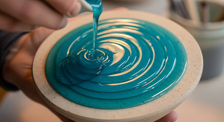 Close-up of artist pouring vibrant blue and green resin onto a wooden round board