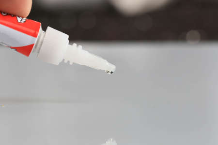 Glue for eyelashes squeezed out of a tube with a soft brush, a drop of glue close-up, macro shooting