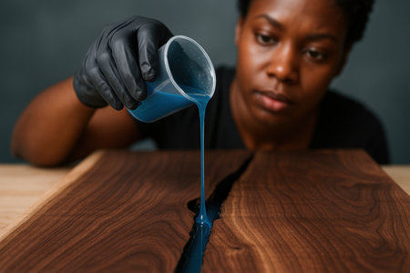 Focused artisan pours blue epoxy resin into wooden table gap, highlighting modern woodworking, craftsmanship, and creative design.