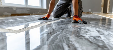 Worker installing marble flooring in partially finished apartment, completing installation task
