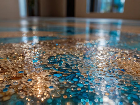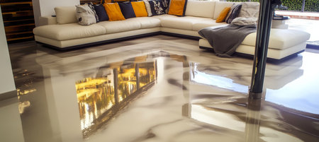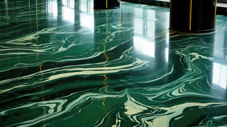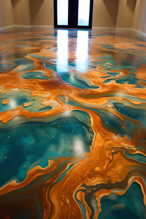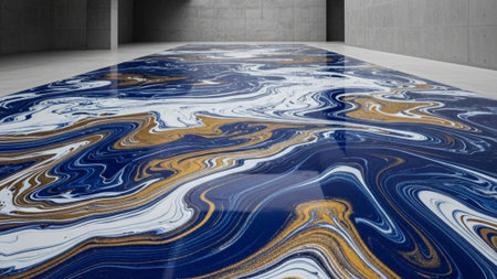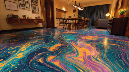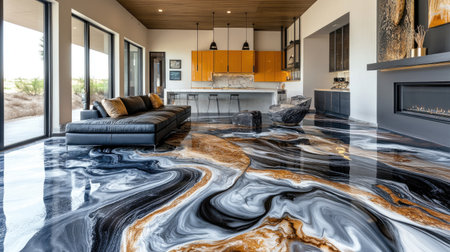 Marbled epoxy flooring in a luxury interior, seamless blend of organic and industrial design with high-end decor elements.