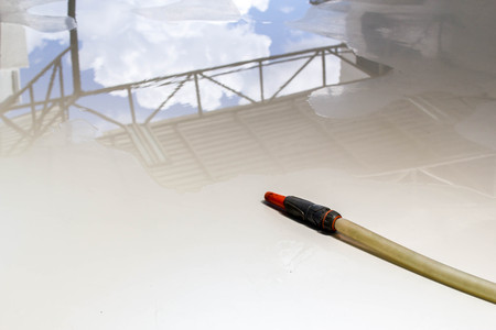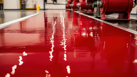 This image captures a vibrant glossy red surface reflecting machinery and pump equipment, showcasing a modern industrial environment with sharp details.