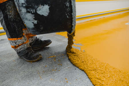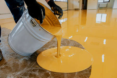 A worker applies the primer to the concrete floor.Epoxy resin project