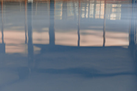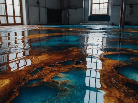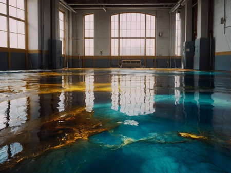 Abandoned factory interior with reflections of sunlight and clouds in water