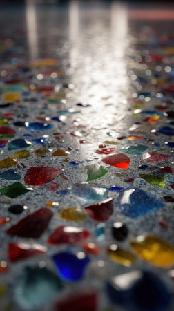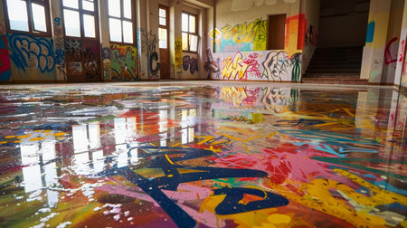 A lively indoor corridor featuring a glossy, multicolored floor bathed in sunlight, with dynamic murals that inspire creativity and joy.