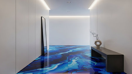 A contemporary hallway features a vibrant blue, abstract floor design. The scene is illuminated by overhead lighting, creating a bright and airy atmosphere. The minimalist interior includes a dark bench and a decorative vase, suggesting a modern aesthetic suitable for various commercial applications.