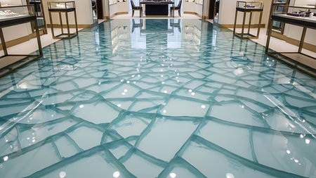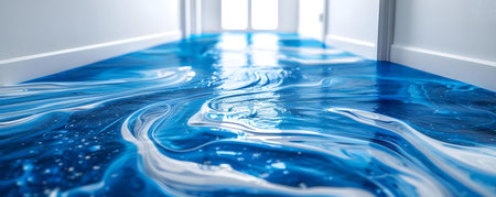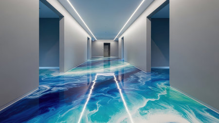 An interior hallway features a striking floor design with shades of blue and white, resembling flowing water or abstract patterns. Overhead linear lights illuminate the space. The composition emphasizes perspective, suggesting depth. This image can be used for conceptual projects or commercial purposes related to interior design and artistic aesthetics.