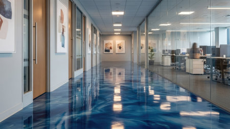 A contemporary office corridor features a vibrant blue, reflective floor and expansive glass walls. The composition captures a sense of depth and spaciousness. The interior design suggests a professional setting with potential use in business, architectural, and design contexts.