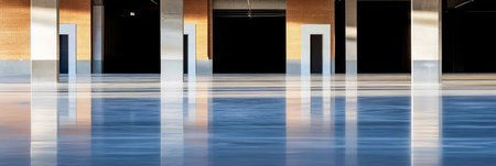 An expansive industrial space features polished concrete flooring reflecting light and shadows. Empty doorways lead to darkened areas emphasizing the simplicity and openness of the environment.