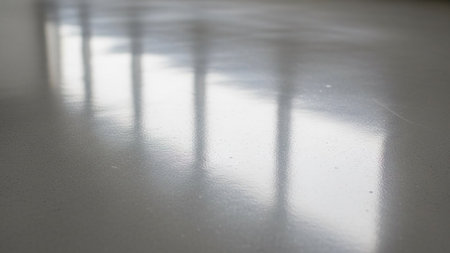 Light showing smooth gray polished concrete floor surface reflecting window light streaks and shadows keywords:...