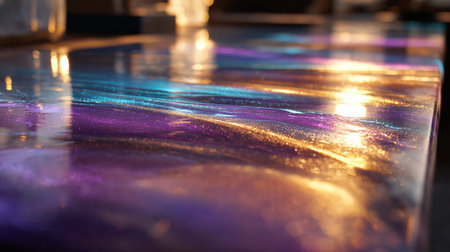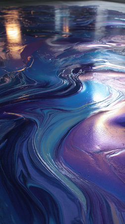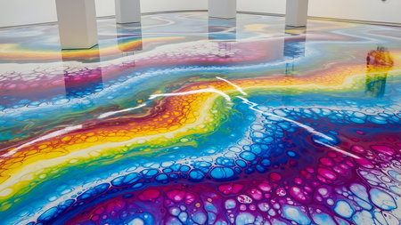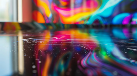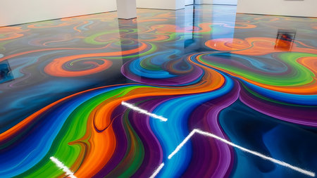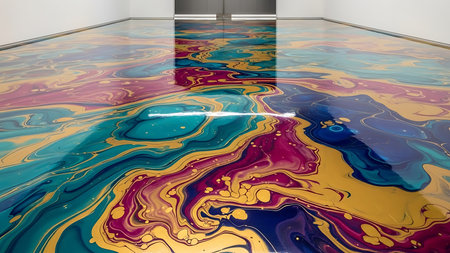 A highly reflective floor surface featuring a vibrant abstract fluid art pattern. The design includes swirling shades of teal, magenta, blue, and metallic gold, creating a dynamic and modern aesthetic in a minimalist room.