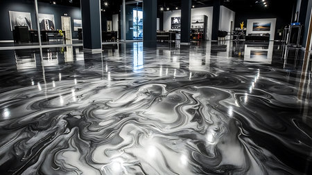 A wide-angle shot captures a contemporary interior space featuring a striking high-gloss black and white marbled epoxy resin floor. The reflective surface creates a sleek and sophisticated atmosphere in the showroom setting.