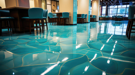 Epoxy floor interior of a modern hotel lobby with blue marble flooring.