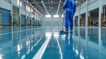 Worker in Blue Uniform Polishes Epoxy Floor in Service Center