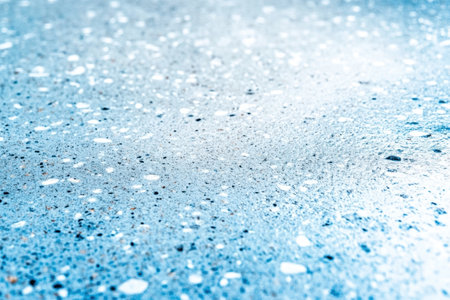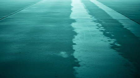 A close-up view of a wet concrete surface, showing a prominent streak of water that creates a distinct pattern. The cool teal and blue tones are reflected in the dampness, giving the texture a slightly luminous The lines of the concrete slabs are visible, adding a sense of structure to the abstract composition. captures the subtle beauty of everyday surfaces transformed by moisture and light.