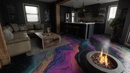 This interior showcases a living room with a unique epoxy floor design. The room features a sectional sofa, a coffee table, and a fire pit. The lighting suggests an indoor setting with potential for use in architectural, lifestyle, and design-related commercial projects. The color palette incorporates vibrant hues, creating a visually dynamic composition.