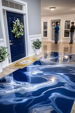Modern Home Interior With Shiny Blue Epoxy Resin Floor In Entrance Hallway, Door, And Houseplant