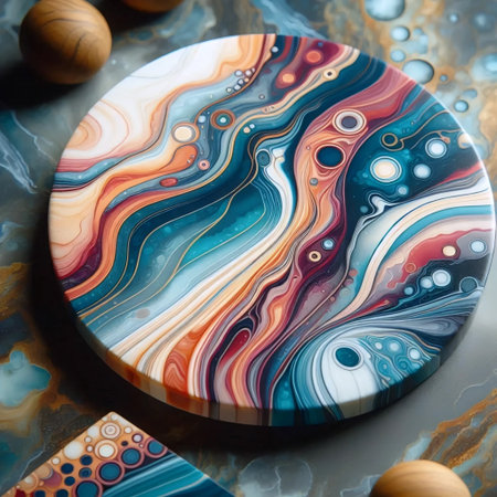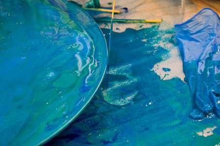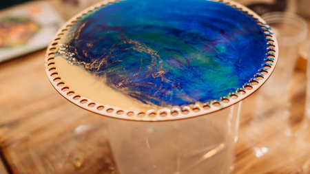 The process of creating a home-made trendy abstract modern pattern painted with a brush of acrylic blue multi-colored resin on a round wooden board.