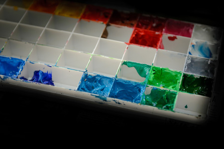 Used palette of watercolor paints. Materials for creativity. Top view with copy space, flat lay