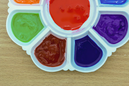 A studio shot of a palette with various colorful watercolors. Perfect for art projects and school supplies.