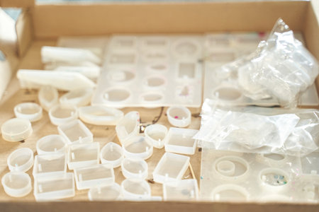 Hands crafting jewelry with silicone molds and resin in artistic workspace.