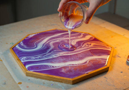 Close-up of artist pouring vibrant purple and white resin onto a wooden round board
