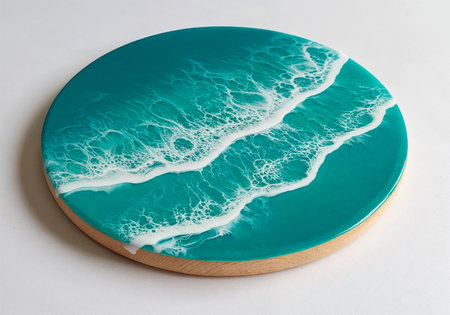 Close-up of artist pouring vibrant blue and green resin onto a wooden round board