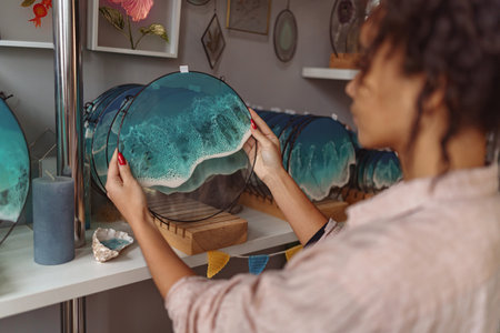 Woman decorator puts handmade epoxy resin glass tray with sea waves on stand in art studio
