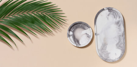 Gray empty decorative plate and green palm leaf on a beige background, product and cosmetic display stage, top view