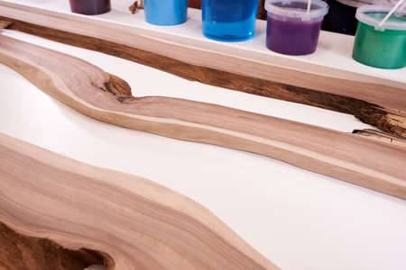Exclusive handmade table of solid wood and epoxy resin on the background of wood boards