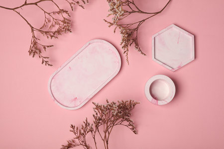 Set of Decorative pink plaster trays of different shapes on a pink background with dried flowers. Stands for candles organizers for cosmetics or jewelry. Top view