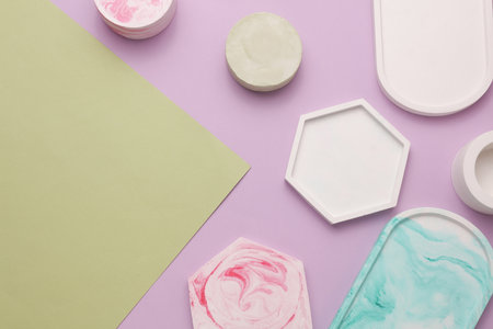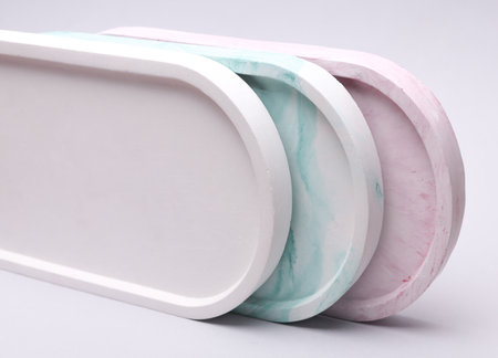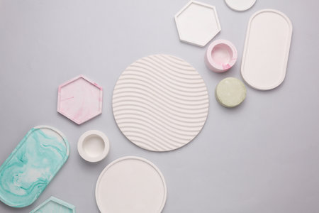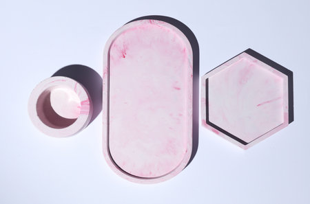 Set of Decorative pink plaster trays of different shapes on white background. Stands for candles organizers for cosmetics or jewelry. Top view